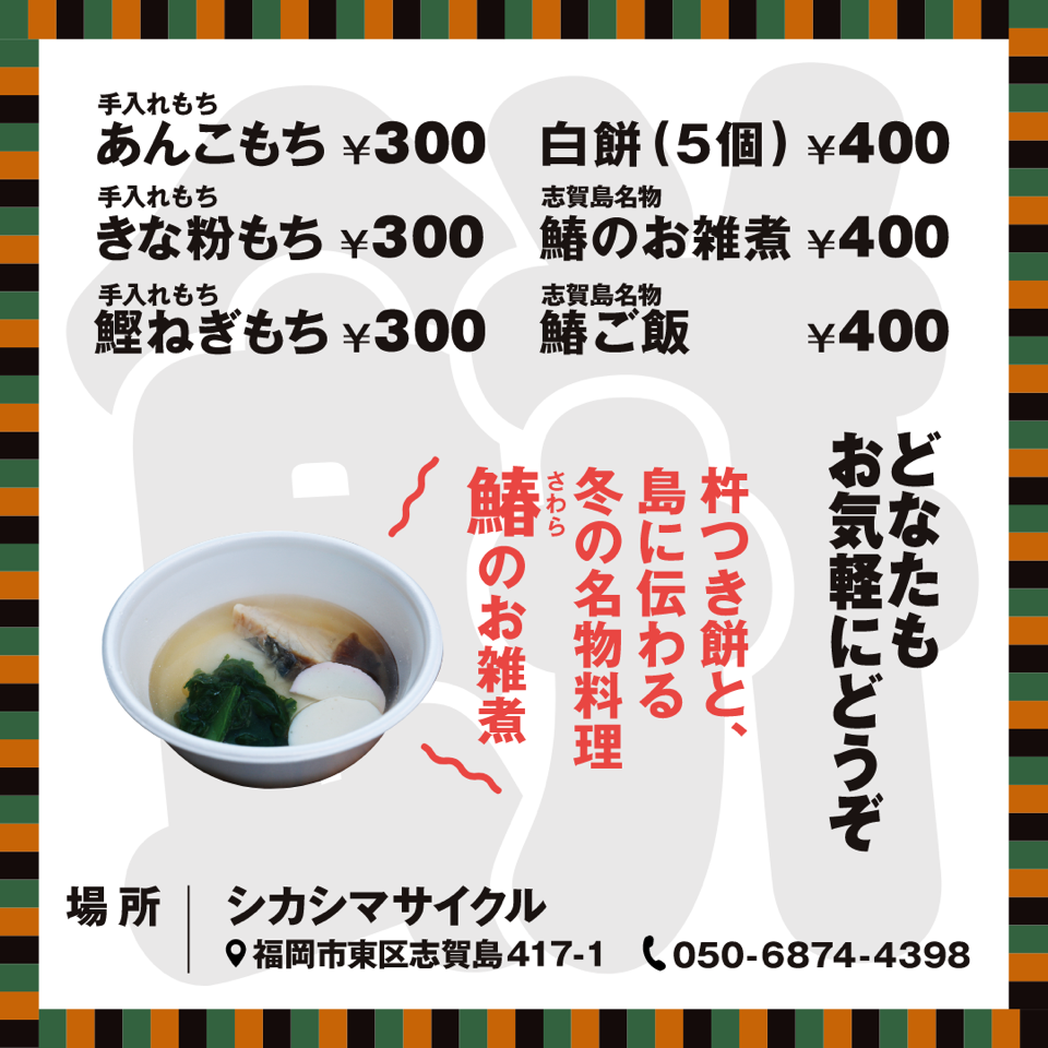 - 料金:参加無料、あんこもち ¥300、きな粉もち ¥300、鰹ねぎもち ¥300、白餅(5個) ¥400、サワラのお雑煮 ¥400、鰆ご飯 ¥400